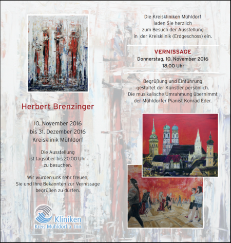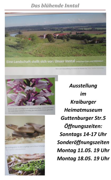 Am Montag, 05.10.2015 um 20 Uhr findet die Vernissage im Heimatmuseum Kraiburg statt, an den darauf folgenden Sonntagen ist das Museum von 14 bis 17 Uhr geöffnet. Die Schlussveranstaltung findet am Montag, den 02.11.2015 um 20 Uhr statt.