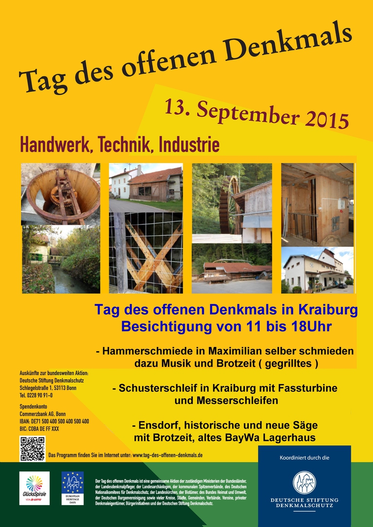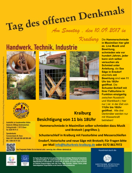 Hammerschmiede in Maximilian selber schmieden dazu Musik und Brotzeit (gegrilltes);Schusterschleif in Kraiburg mit Fassturbine und Messerschleifen;Ensdorf, historische und neue Säge mit