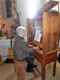 Zu Beginn und am Ende waren Musikstücke am Portativ, einer Orgel mit Lippenpfeifen, zu hören, gespielt von Monika Meyer. Im Wechsel wurden stimmungsvolle bayerische Weisen von der Auer Hackbrettmusi,