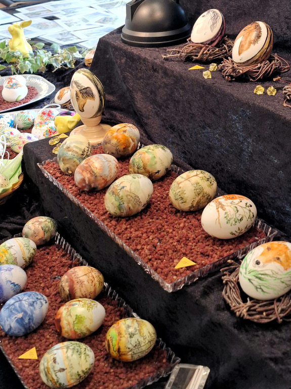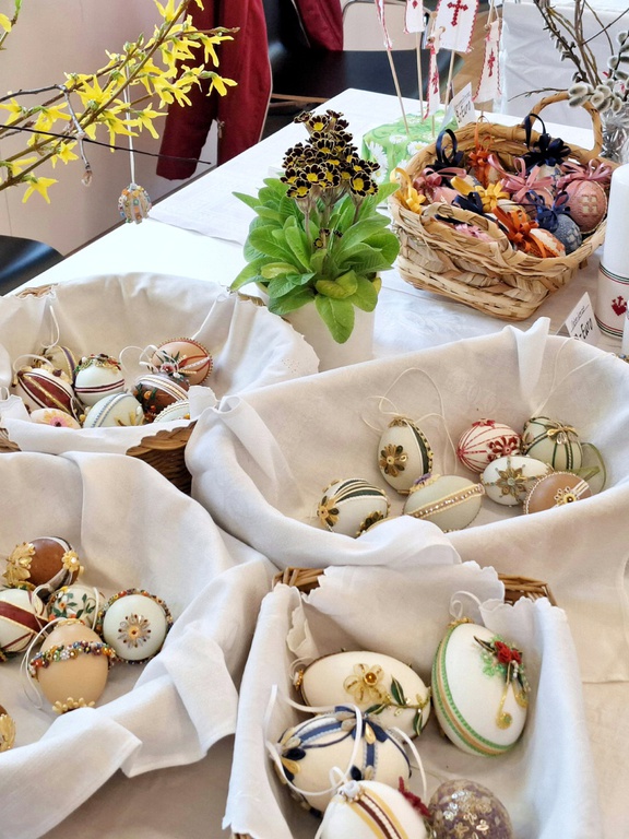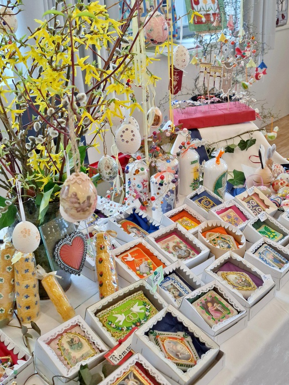 Aquarell-Technik, in gestickter Ummantelung oder in anderer Weise verziert. Geschmackvoll wurde auch österliches Kunsthandwerk in Holz, Wachs und Keramik ausgestellt sowie Frühlingsblumen zum Kauf