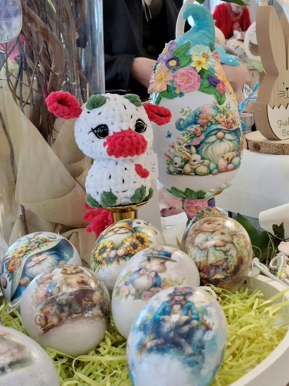 Zum Kauf angeboten war eine große Vielfalt von kunstvollen gestalteten Eiern in verschiedensten Techniken (unser Bild; das Motiv: "Das Mädchen mit dem Perlenohrring), bemalt mit Acrylfarben oder in
